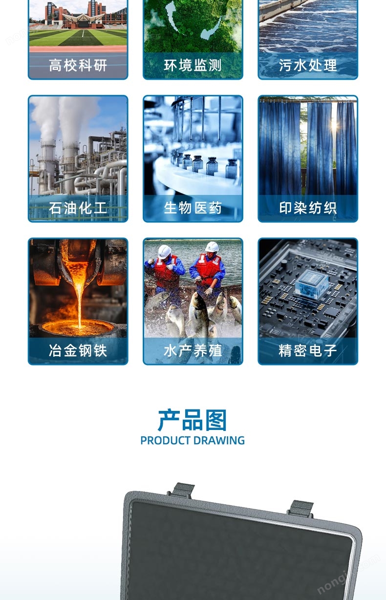 可廣泛應(yīng)用于水環(huán)境檢測系統(tǒng)、污水處理廠、自來水公司、石油化工、高??蒲性核?、水文水利、冶金鋼鐵、生物醫(yī)藥、農(nóng)業(yè)環(huán)境監(jiān)測、毛紡印染、海洋環(huán)境監(jiān)測、造紙、醫(yī)藥、農(nóng)業(yè)科技、海洋運輸?shù)阮I(lǐng)域進行實地監(jiān)測、應(yīng)急監(jiān)測。