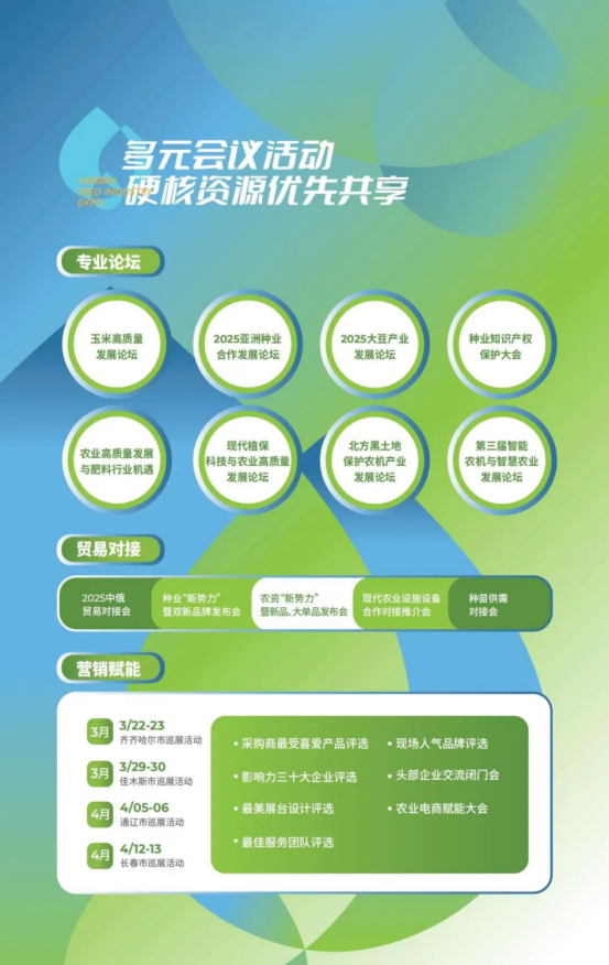 哈爾濱種業(yè)博覽會始于1995,由智奧會展(哈爾濱)有限公司主辦,是中國種業(yè)歷史悠久、規(guī)模龐大、影響深遠(yuǎn)的綜合會展平臺,在業(yè)內(nèi)人士中享有廣泛的認(rèn)可度和美譽(yù)。在農(nóng)業(yè)發(fā)展邁向新征程的2025年,展會積極順應(yīng)時代發(fā)展形式,滿足市場發(fā)展需求,開拓一展兩期,向更精細(xì)化、更專業(yè)化發(fā)展,為行業(yè)帶來全新的震撼體驗(yàn)!