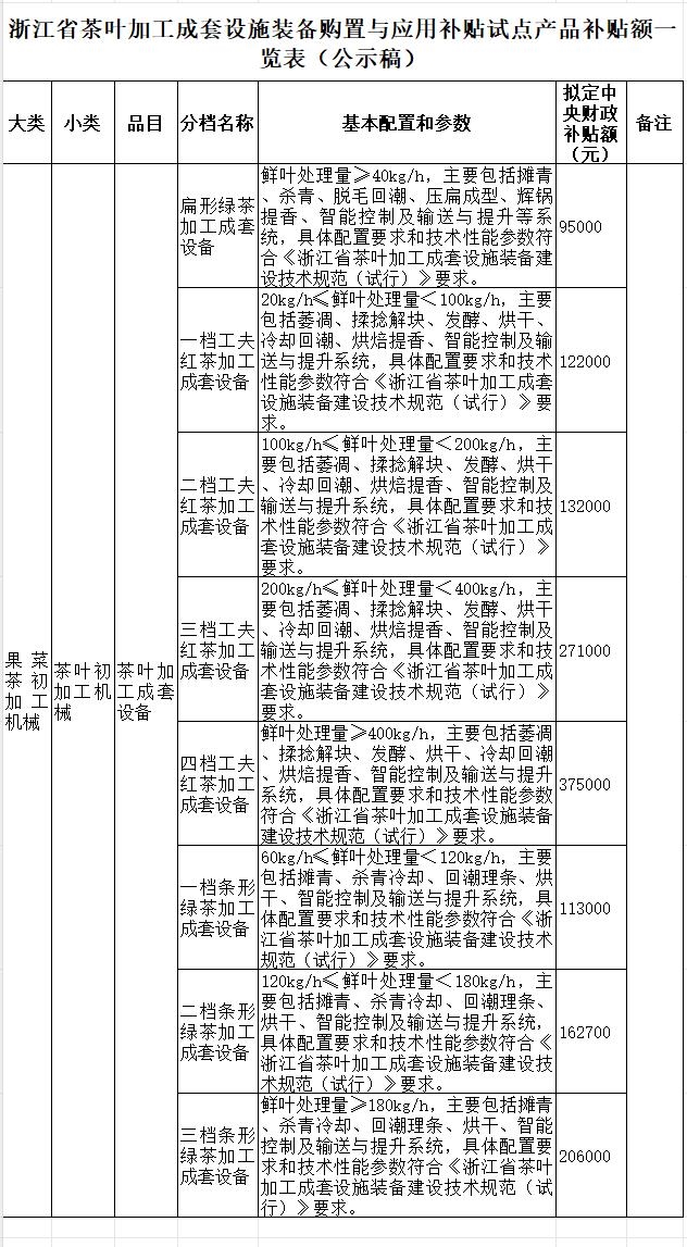 浙江省茶葉加工成套設(shè)施裝備等農(nóng)機新產(chǎn)品補貼額一覽表公示