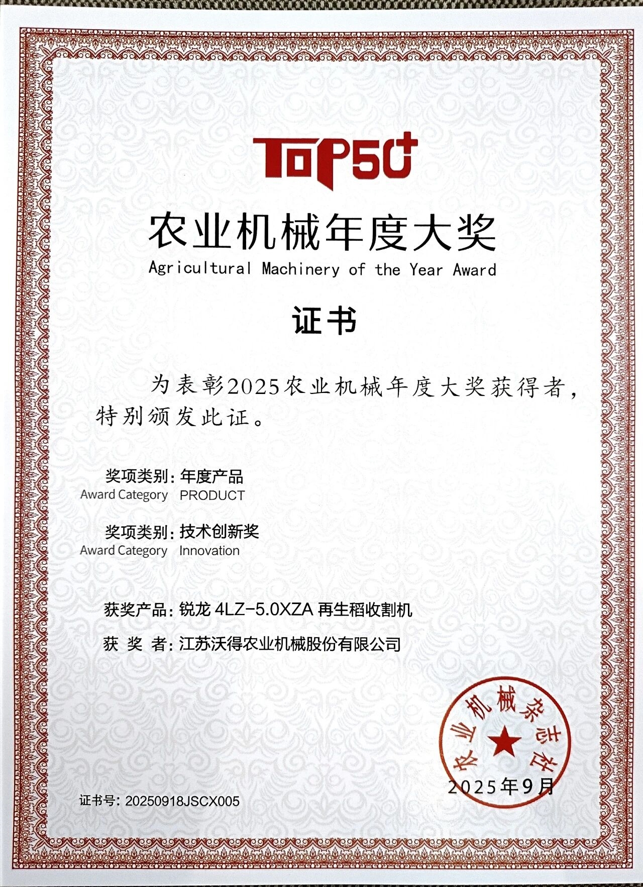 本屆大獎設(shè)立多個權(quán)威獎項,經(jīng)過激烈角逐和嚴(yán)格評審,沃得農(nóng)機(jī)表現(xiàn)卓越,憑借多款明星產(chǎn)品與系統(tǒng)性創(chuàng)新能力一舉斬獲五項重磅大獎。其中,沃得農(nóng)機(jī)榮獲