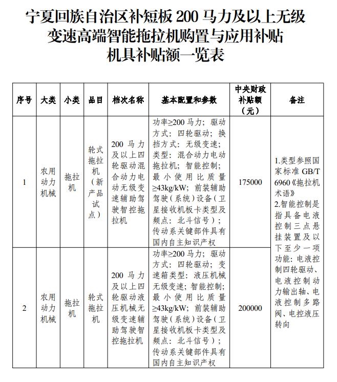 拖拉機購置與應(yīng)用補貼試點實施方案》(簡稱《實施方案》),對國家重點推廣的補短板200馬力及以上無級變速高端智能拖拉機實施購置與應(yīng)用補貼。