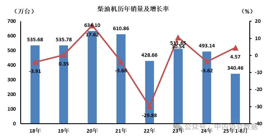2025年8月柴油內(nèi)燃機(jī)銷售37.25萬臺,同比增長5.56%