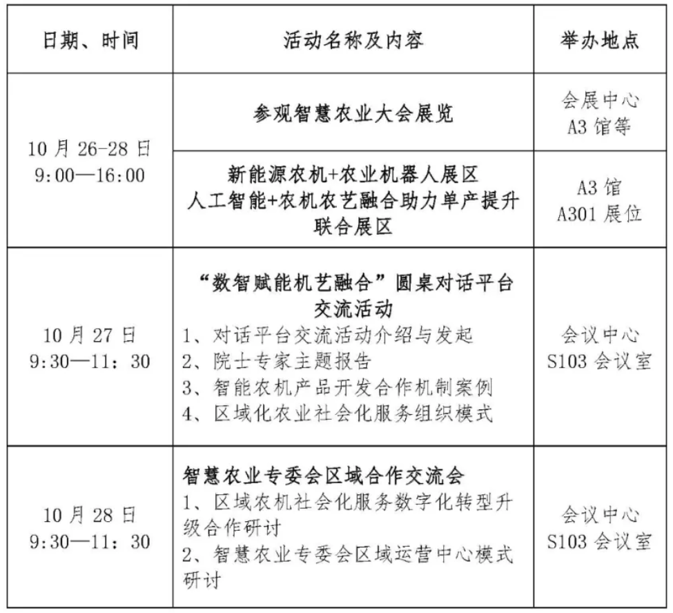 1、參觀人工智能+農(nóng)機(jī)農(nóng)藝融合單產(chǎn)提升實(shí)踐成果及配套技術(shù)與裝備展示,參觀新能源農(nóng)機(jī)與農(nóng)業(yè)機(jī)器人展示(專委會成員單位可主動申請?jiān)诠矃^(qū)域免費(fèi)展示相關(guān)技術(shù)與產(chǎn)品);